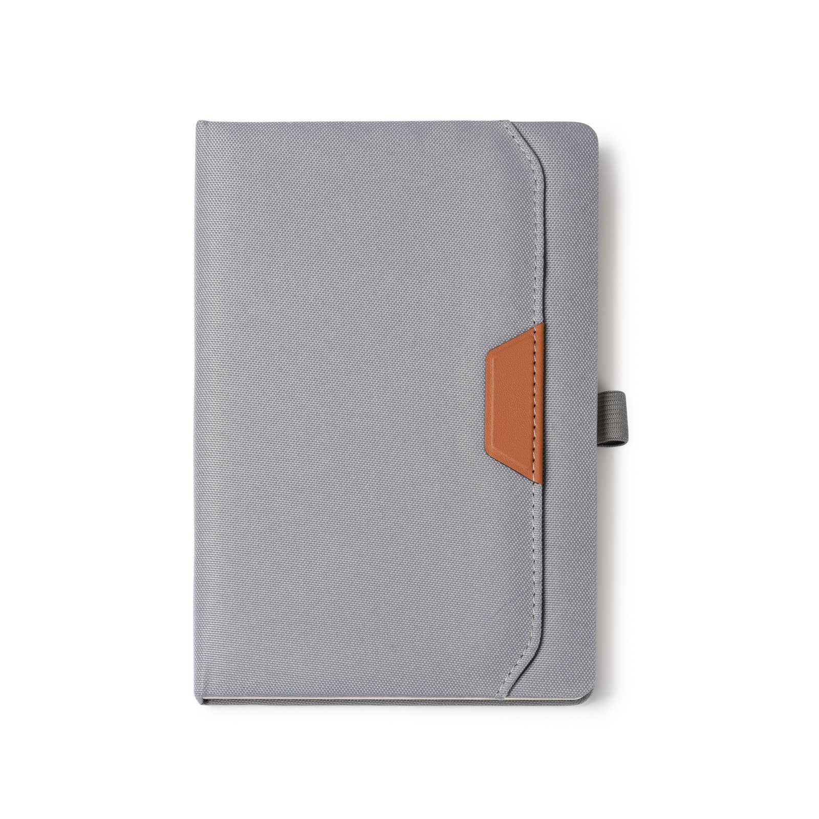 Bloc de notas A5 con tapa rígida de RPET 600D y PU Leather con bolsillo exterior. Incluye soporte para bolígrafo. 80 hojas rayadas de 80 g/m².