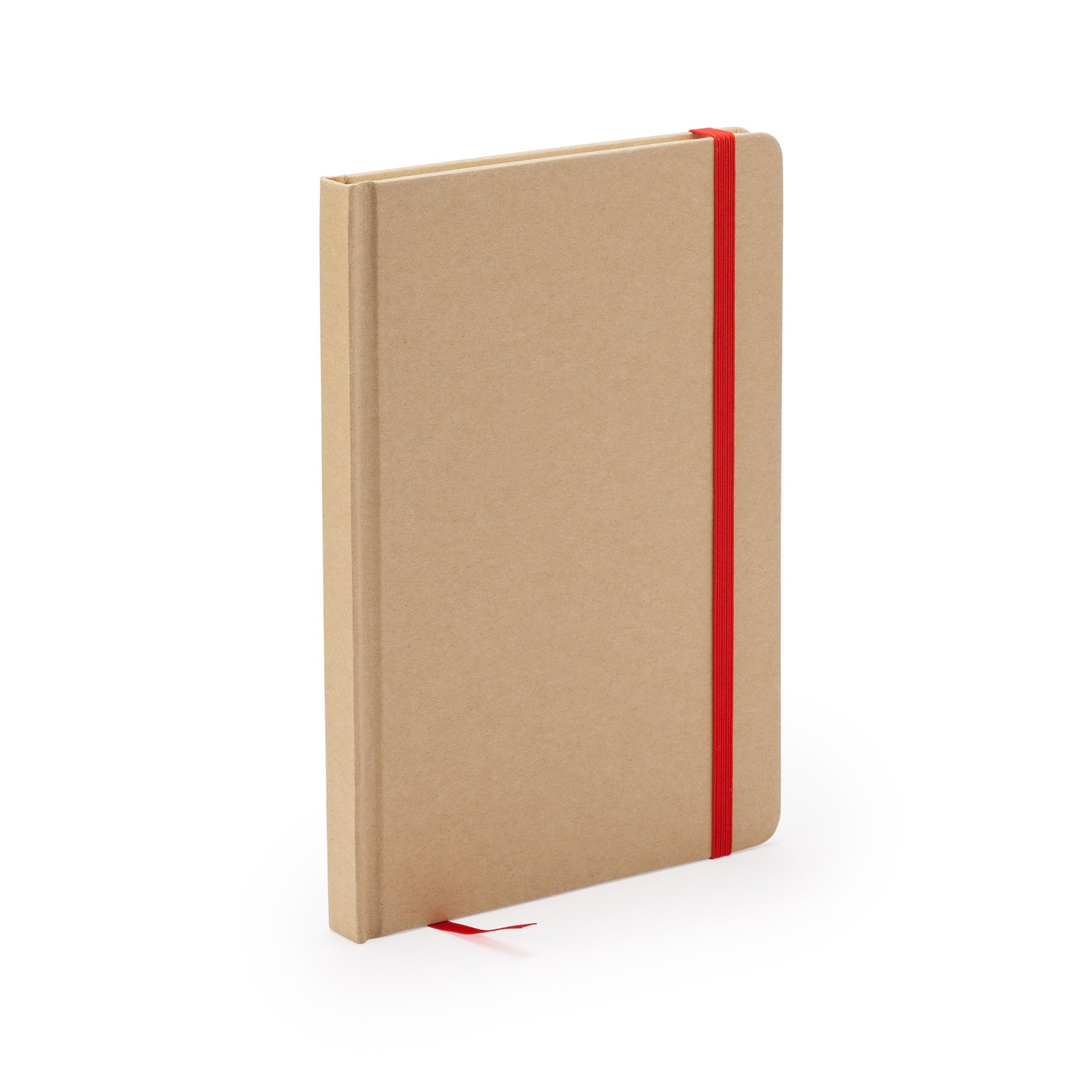 Bloc de notas A5. Tapa rígida de cartón reciclado. Marcapáginas y banda elástica a color. 100 hojas lisas.