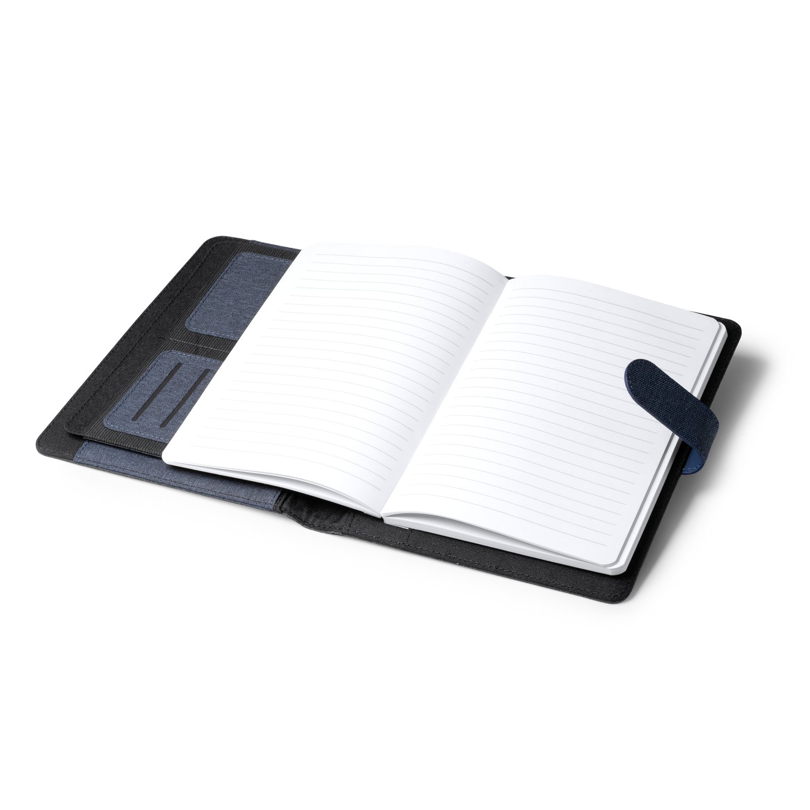 Carpeta multiusos realizada en RPET. Tiene un tamaño A5 y cuenta con cierre magnético. Incluye, además, un bloc de notas extraíble de 80 hojas a rayas. Cuenta con 3 compartimentos principales interiores, 2 tarjeteros interiores y soporte para bolígrafo.